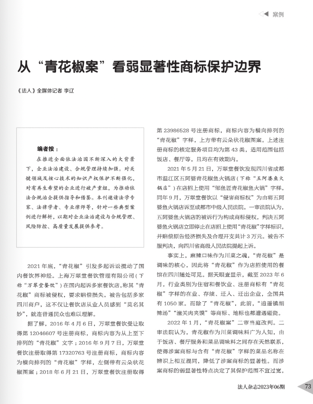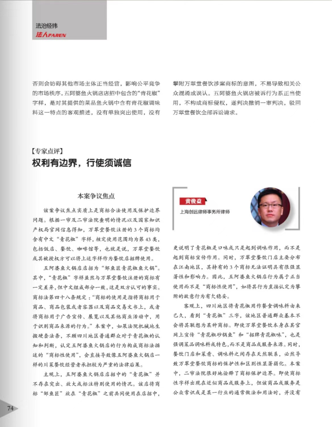 重庆辉知简讯 | 辉知队黄俊益律师应“法治日报”旗下杂志邀请,就“青花椒”案发表专家点评